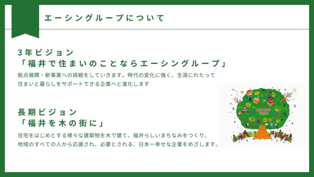 2026.04.23 未分類 インターンシップ完全ガイド エーシングループの家づくりを、“体験”で理解する5日間 インターンシップでは、土地選びから設計・提案まで、エーシングループの家づくりの流れを丸ごと体感していただきます。最大の特徴は、「つくる側」と「住む側」の両方を経験できること。グループワークなので知識がない方でも楽しく参加できます!【対象となる学生】全学部全学科OK/家づくりに興味がある方 「そろそろインターンに行かなきゃ」と思いつつ、こんな不安を抱えていませんか? 「建築学科じゃないけど、知識ゼロで参加して大丈夫?」「自分に向いている仕事がまだ全然わからない。そんな状態で参加してもいいのかな?」実は、今エーシングループで活躍している先輩たちも、去年の今頃は全く同じ不安を感じていました。 家づくりの流れに沿って理想の住まいを作ろう! “つくる側”と“住む側”、両方を体験しよう! 【ポイント】一気通貫の体験: 土地選びから設計プレゼンまで、5日間で家づくりの流れを丸ごと体感。 知識ゼロでOK: 社員がチームに伴走するので、文理不問で「プロの思考」を間近に学べます。【体験できること】現場のリアル: 施工現場やモデルハウスを巡り、住まいができる「裏側」を知ることができます。二つの視点: 「つくるプロ」と「住むお客様」の両方の立場を経験できます。【今回ならではのこと】社員との交流:多数の現場社員がチームに加わり、ワークを直接サポート。休憩中も「仕事のホンネ」を聞くことができますチームで成長: グループワーク形式なので、仲間と補い合いながら安心して「最高の住まい」をカタチにできます。 この5日間でしか得られない特別な体験 毎年大人気!5日間のプログラム 1日目:会社概要説明、不動産について、分譲地案内代表の永森よりエーシングループについてお話しします2日目:家づくりについて、工務について、施工現場見学家が建つまでの流れを現場見学を通じて、住まいづくりについて理解を深めよう3日目:営業ロールプレイング、理想の住まいについてのヒアリング実際にモデルハウスを社員役として案内していただきます。お客様の理想を深く引き出すヒアリングの仕方を学べます。4日目:理想の住まいについて間取り作成ヒアリングした要望を、間取りに落とし込んでいきます。グループでひとつの住まいをつくりあげます。5日目:内装プラン作成、プレゼン発表家のテイストに合わせて、色や素材をコーディネート。居心地をデザインする楽しさを実感してください。自分たちが考え抜いたプランを、お客様役へ提案。どうすれば伝わるか、最後までチームで考えます。最後に、最前線で働く社員が本気で講評。よかったところや、プロの視点での改善点など、ここだけの「学び」を持ち帰ってください。 リアルな仕事を、そのまま体験! ◇分譲地案内福井県内No.1の土地保有数を誇る私たちだからこそ、単に「土地を売る」のではなく、お客様一人ひとりの「理想のライフスタイル」に最適な場所を提案できる強みがあります。 「好きな家」を建てるための第一歩として、土地選びがどれほど暮らしの質に直結するのか。その重要性を現場を歩きながら体感していただきます。◇理想の住まいづくり「家」ではなく「暮らし」をデザインする「建物という箱」をつくるのではなく、何十年と続く「かけがえのない暮らし」をつくること。居心地の良さを徹底的に追求するプロセスを通じて、私たちが提供している価値の本質を肌で感じていただきます。 エーシングループについて 開催概要 日程:5days 2026年8月24日(月)~29日(土)(※26日定休)日程:3days 2026年8月20日(木)~22日(土)時間:9:00~17:00会場:福井市上北野1丁目7番7号(福井自動車学校横)Googlemap交通:福井駅から送迎あり エーシングループのインターンシップは、単なる仕事体験の場ではなく、皆さんが「自分自身の働く価値観」を見つける場にしたいと考えています。建築の知識は問いません。それよりも、「家づくりを通して、どんな暮らしを届けたいか」を、私たちと一緒に楽しみながら考えていきましょう。 ▼インターンシップの詳細・ご予約はこちらから 「とりあえず話を聞いてみたい」という方も大歓迎です! エーシングループの日常や社員の雰囲気は、公式SNSでも発信中。 不安なことや質問があれば、いつでもお気軽にDMをお送りください!